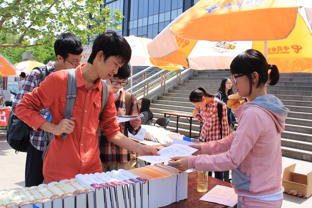 与此同时,文学院学生会在北广场西侧还举办了“以文倾心,以书会友”书籍交换活动。文学院学生会携手多家出版社为同学们带来了一系列新书以供交换,譬如有由十月文艺出版社赞助的小说类图书,如张小娴的《爱上了你》、路遥的《平凡的世界》、毕淑敏的《幸福的七种颜色》等;新星出版社则推荐了多种学术类图书,如张柠的《感伤时代的文学》、张清华的《狂欢或悲戚》等。除此之外,上一届图书交换活动剩余的百余本图书也都运抵现场以供交换。同学们参与热情很高,参与图书交换活动一名同学表示,换到了自己心仪的图书,希望这样的活动能够继续办下去。