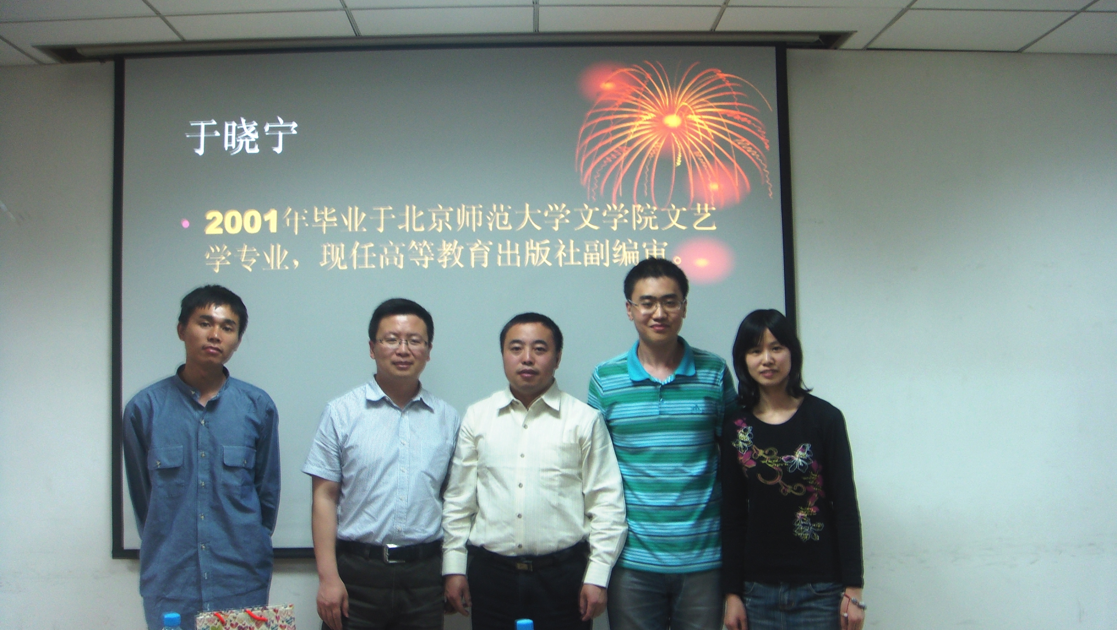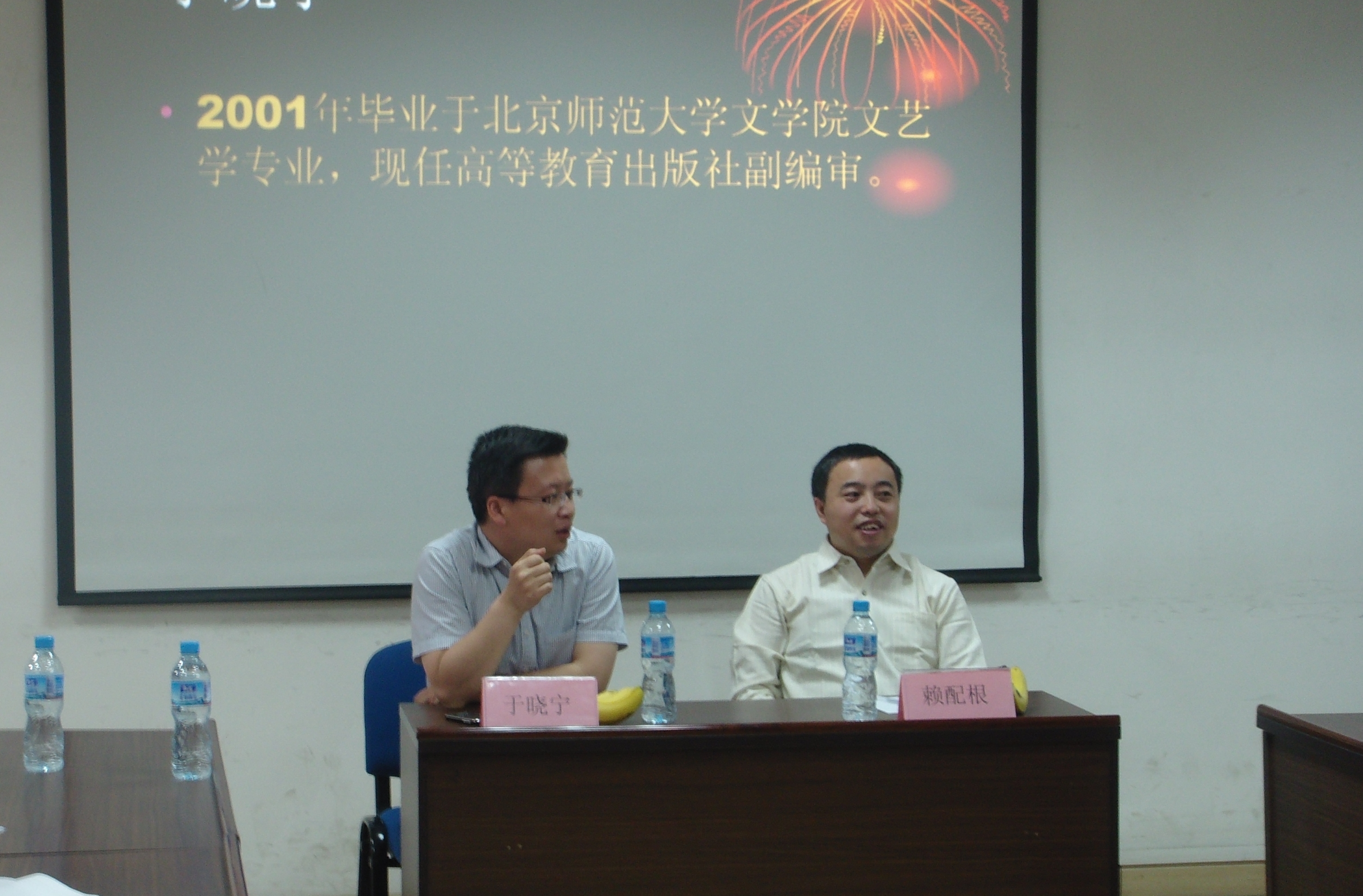 赖配根师兄2000年毕业于北京师范大学文学院中国古典文献学专业,现任中国教育报刊社新闻研究中心主任。于晓宁师兄2001年毕业于北京师范大学文学院文艺学专业,现任高等教育出版社副编审。两位师兄分别详细讲述了他们毕业时找工作的经验、教训,强调了实习对于找工作的重要意义,以及就业时一定要抓住一切机会。