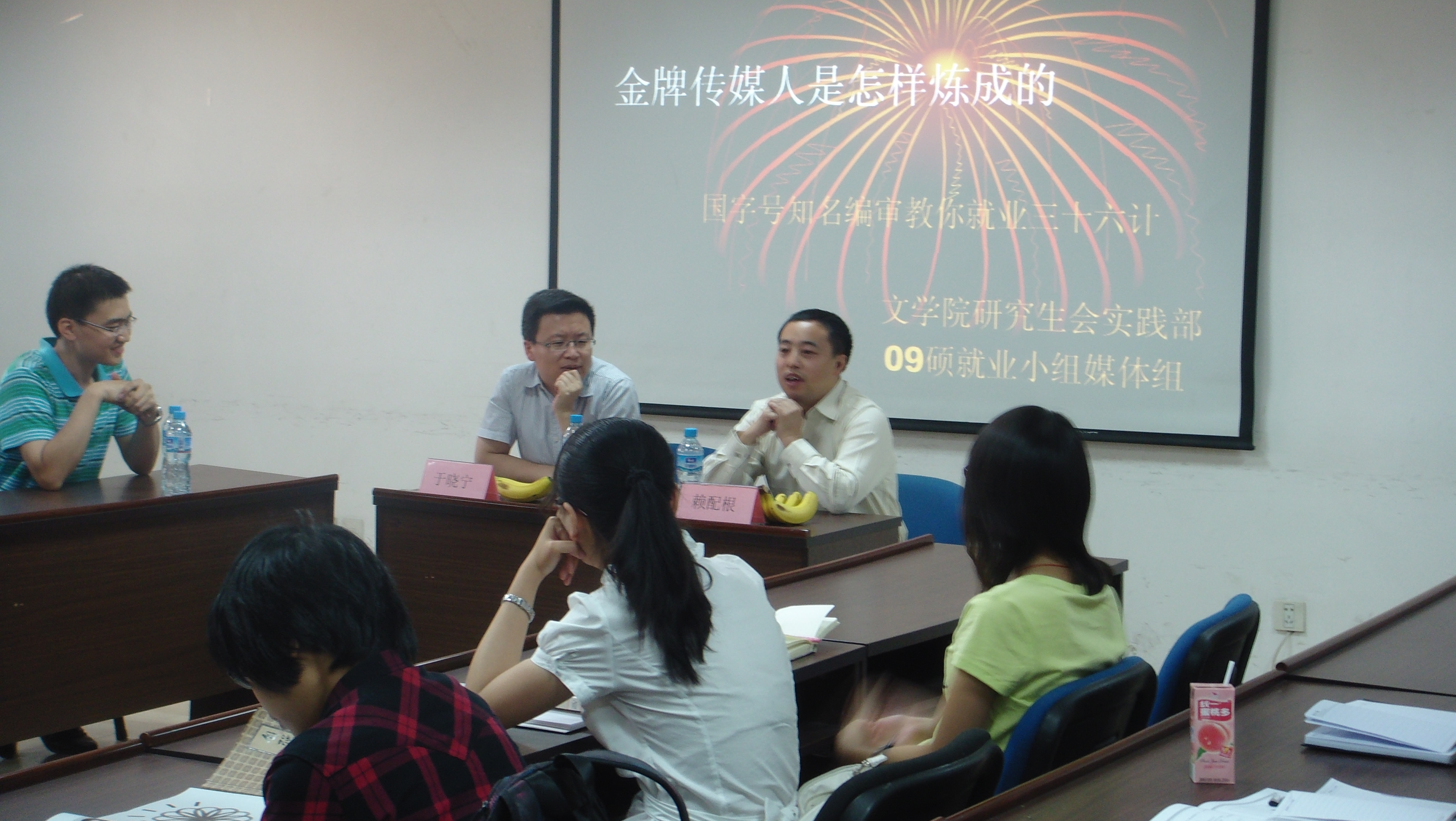 2011年5月21日晚六点半,就业交流活动“金牌传媒人是怎样炼成的——国字号知名编审教你就业三十六计”在主楼A705举办,此次活动由文学院2009级媒体就业组与文学院研究生会实践部主办,邀请到文学院2000级校友赖配根和2001级校友于晓宁。