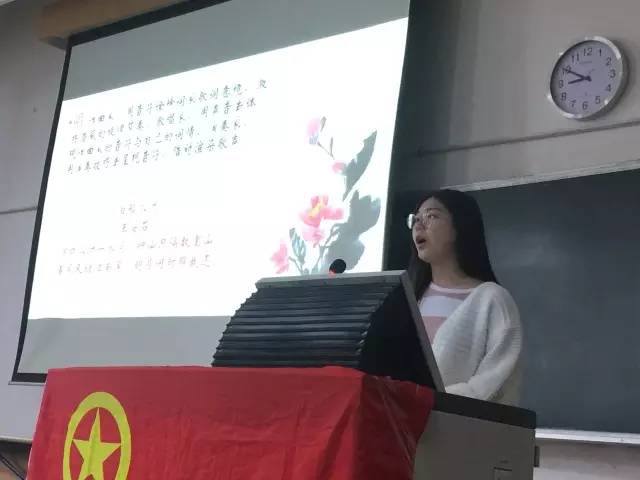 “善歌者,使人继其声,善教者,使人继其志。”南山诗社的代表蔡若葵在特色团课中介绍了古典诗词吟唱的基本概念,阐释了诵吟歌唱这四大核心内涵,并通过吟诵《从军行》让在场同学感受古典诗词吟唱的魅力。最后,她分别从曲调、咬字、情感方面教授在场同学欣赏、吟唱《浪淘沙》。