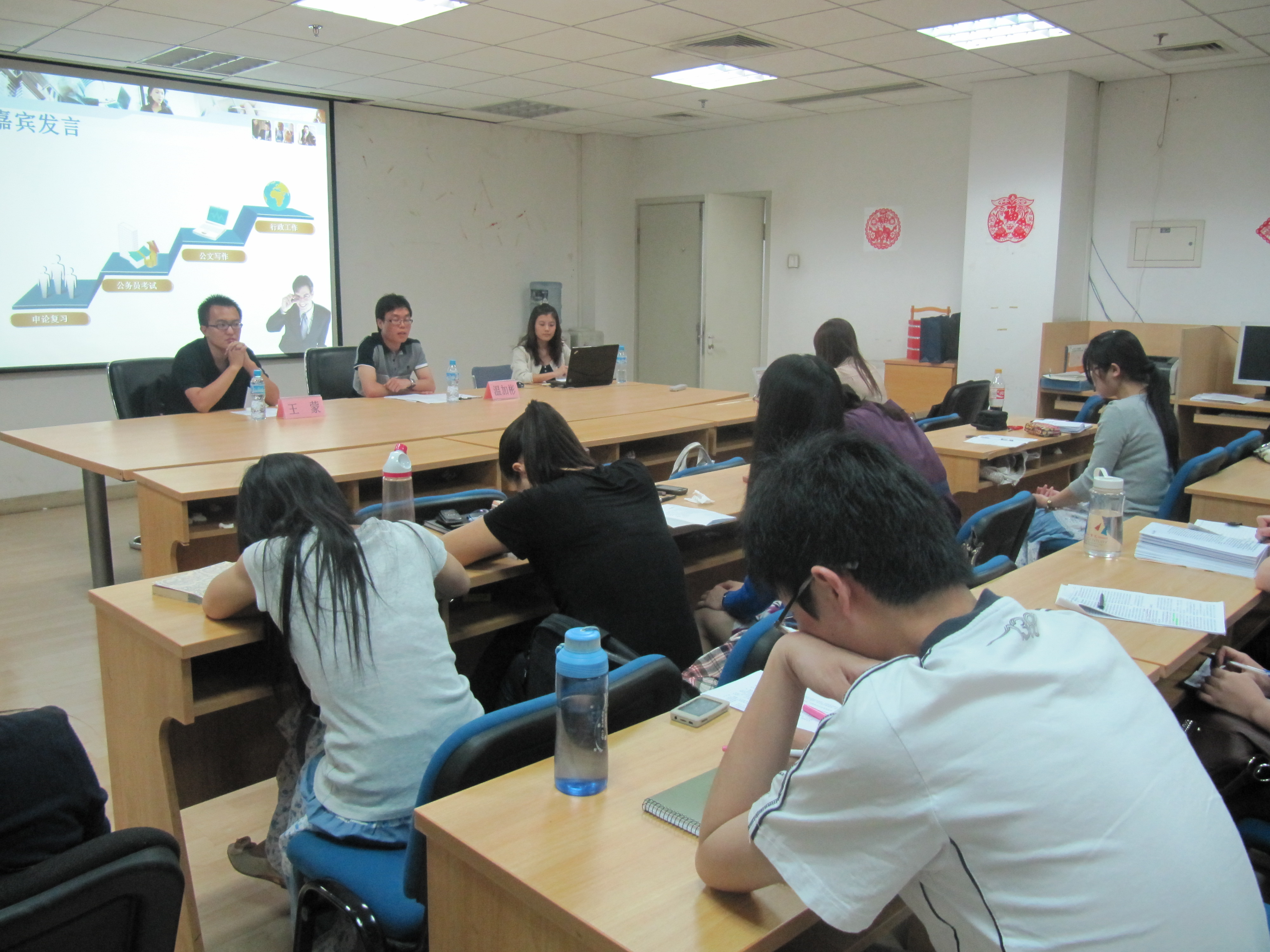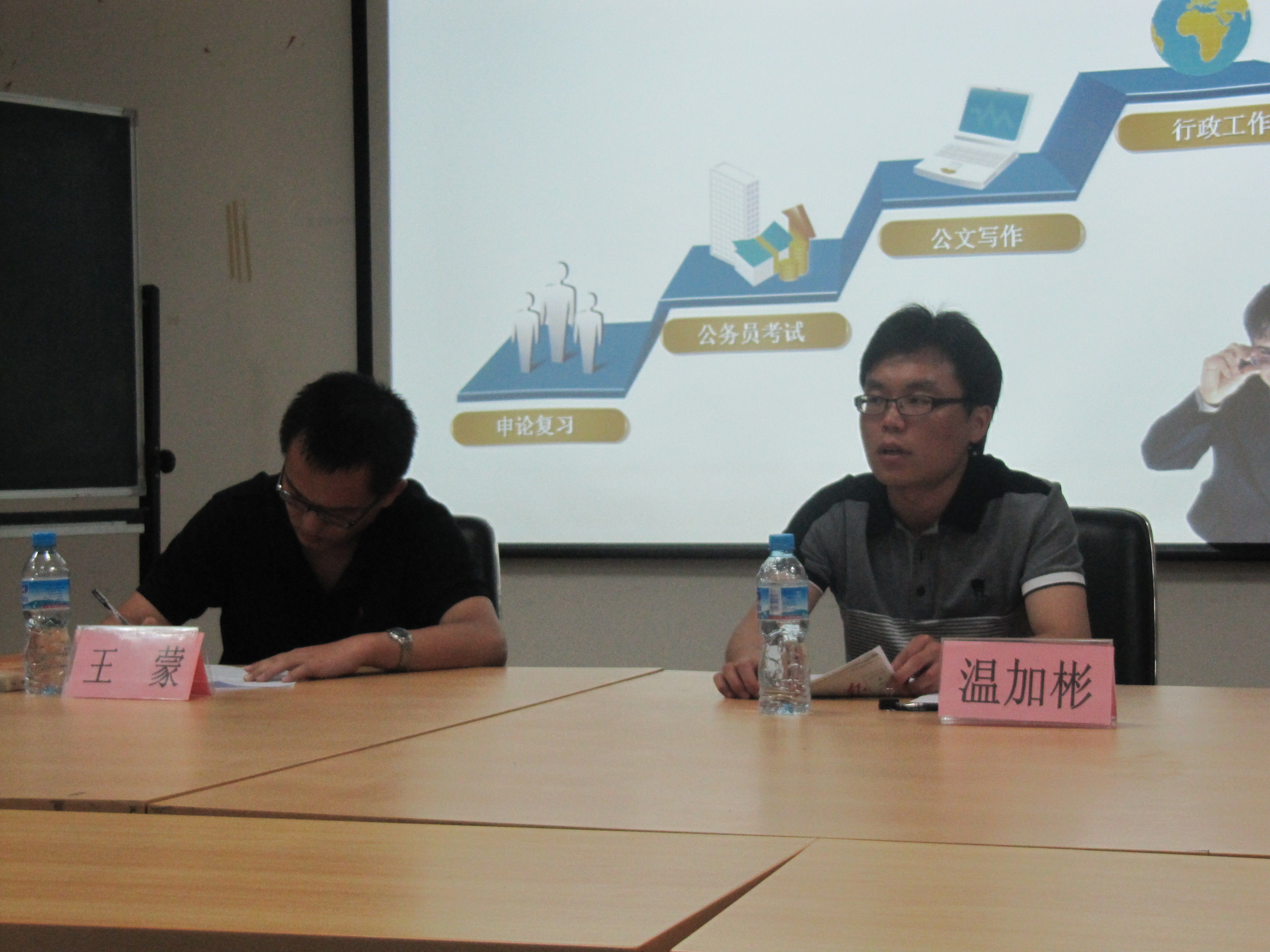温加彬是北师大课程与教学论硕士生,现就职于北京市纪委监察局办公厅,他结合自己申论考试的经验,援引往年申论考试的实例,详细地介绍了申论考试的题型和应答技巧,材料翔实,深入浅出,让现场的同学受益匪浅。王蒙09年从师大文学院毕业,现就职于北京海关,他主要从公务员考试的复习方法入手,着重强调了申论写作中语言的运用问题,风趣幽默,引来现场的阵阵掌声。