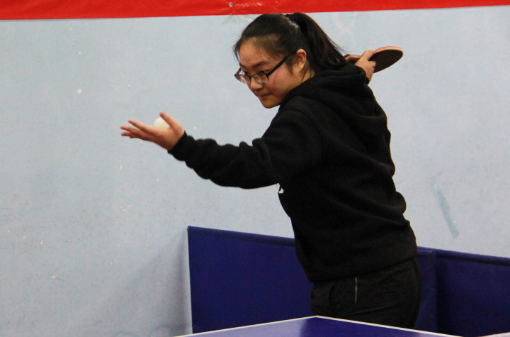 紧接着上场的是获本届文学院“弘毅杯”乒乓球赛女单冠军的选手张蓝允。她在与对手长时间的搓球较量中,以良好的基本功功底和平和的心态一一应对难关。擅长搓球的她在比赛的开始阶段一直保持着防守的状态,但在后期,她反攻为守,多次主动猛拉强攻,不断变换落球点,使对手手足无措。最终,拿下了决赛的第二场比分。