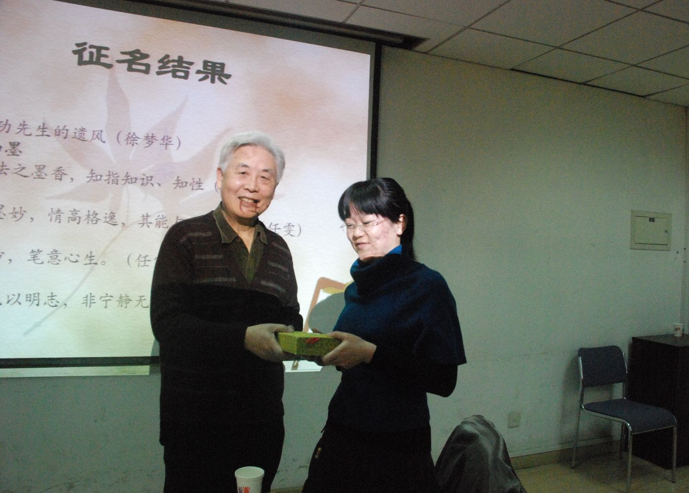 在书法社定名环节中,书法社成员对征集的20余个社名进行民主投票,最终09级当代文学硕士生徐梦华同学提议的“启风书法社”脱颖而出,“行云书法社”与“元白书法社”分获二、三等奖,由赵先生分别为获奖者颁奖。“启风”取“继承启功先生遗风”之意,旨在希望师大的同学们在书法练习,乃至做人、做学问上秉承启先生“学为人师,行为世范”之风范。