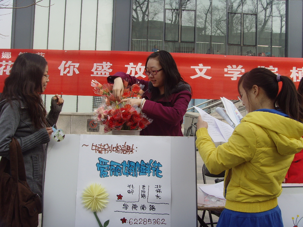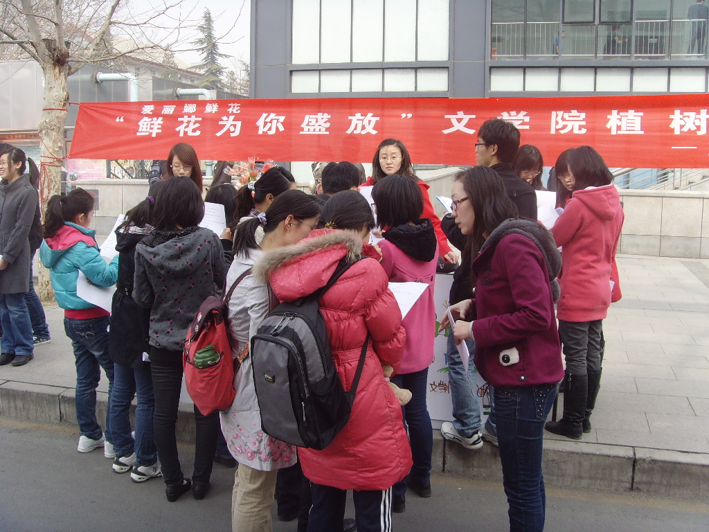 2011年3月12日,在植树节到来之际,文学院研究生会权益部联合爱丽娜鲜花,举办了“鲜花为你盛开”文学院植树节特别活动。