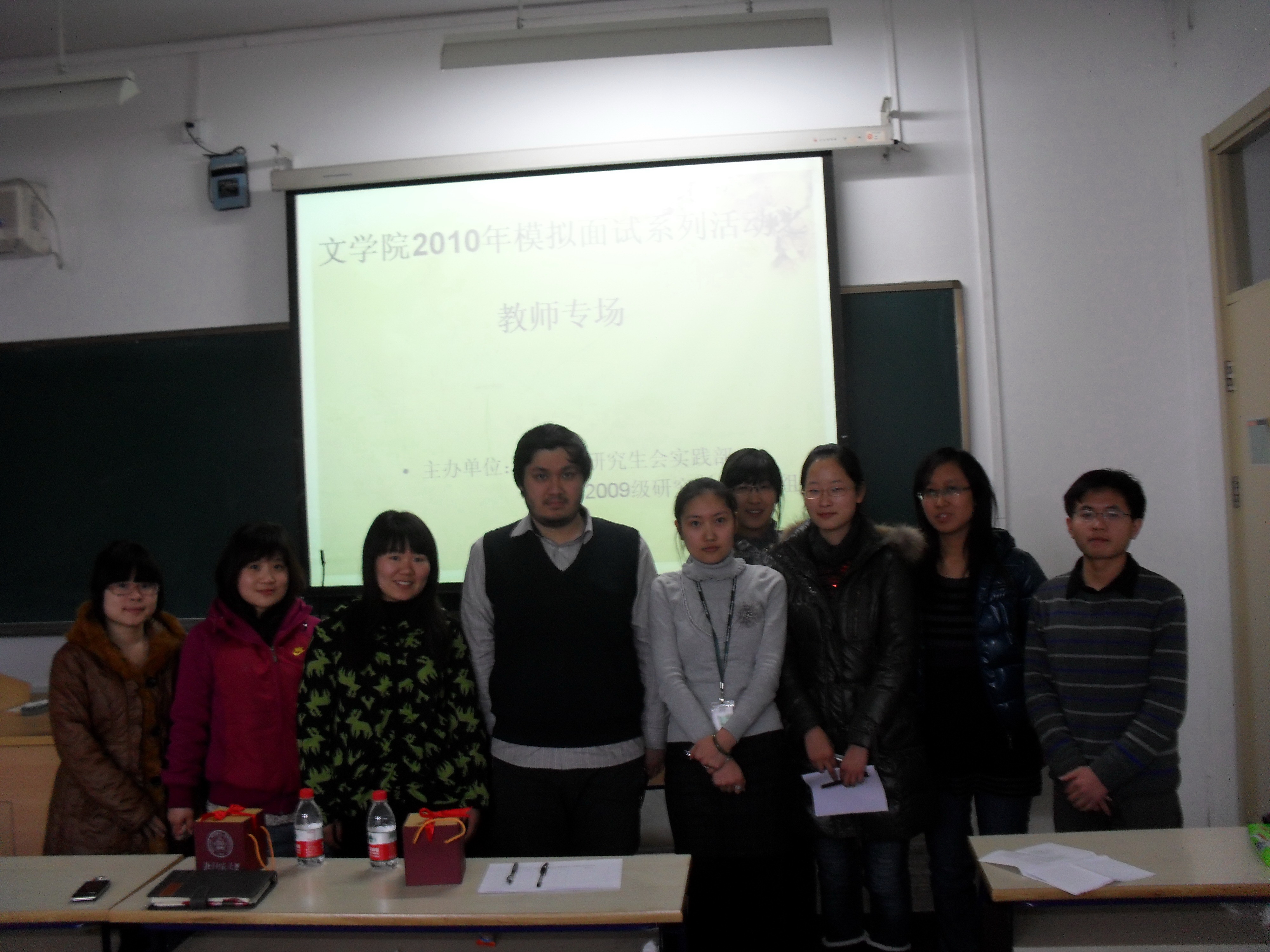 2010年12月26日晚上7点,由文学院研究生会、文学院2009级研究生就业小组主办的“文学院2010年模拟面试系列活动——教师专场”在教二楼215教室举行,此次模拟面试邀请到了新东方学校的资深教师邵老师、杨老师作为点评嘉宾,参与活动的研究生60余人,活动现场气氛热烈。