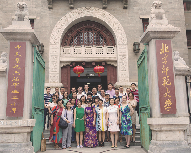 2016年8月6日,中文系本科96届毕业生毕业20周年聚会在励耘报告厅举行,海内外近50余名校友从各地赶来。 文学院院长过常宝教授,曾经给92级开过课的郭英德老师、李正荣老师、班主任易敏老师、陈珊老师、北校工作部的李直老师亲临座谈会。 过常宝院长向同学们介绍了北师大及文学院今日在国际化办学、学术研究、服务社会等方面所取得的卓越成就。老师们忆述当年情景,勉励同学们在人生最辉煌的中年时期继续有作为。尚学峰、钱振纲两位老师因在外地不能前来,还特意录制了视频勉励同学。座谈会上同学们纷纷发言,向老师们汇报毕业后的发展,表达了对母校、对老师的深深感恩和祝福并向老师和文学院赠送了礼品。下午,同学们还重返北校,找寻大一时在北校学习生活的印迹,重温大学第一课。聚会结束时,大家都依依不舍,约定来年再相会。